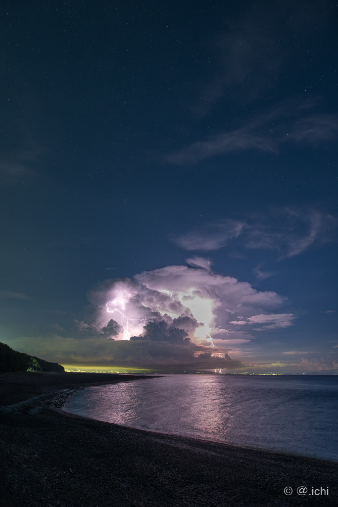 (少しアンダー気味に撮影し、レタッチで雲の質感を浮き上がらせるつもりだったのですが、雷雲の放電の光りは強烈で、残念ながら白飛びした部分には画像情報は残っていませんでした)