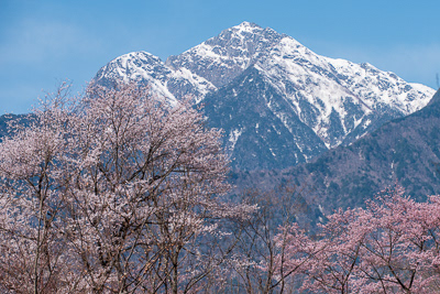 発達した低気圧が通過し移動性高気圧が張り出し始め、春の嵐が空気中の黄砂や塵・花粉を一掃した透き通った空気の中で、風雨に耐えた強くそして儚い桜の花が、まだ頂が白いジャイアンツを背景に光り輝く瞬間です