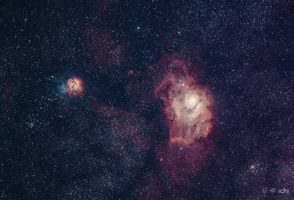 画像中心にある赤い星雲はM8干潟星雲、その上にはM20三裂星雲が赤と青の小さな斑点のように確認できます