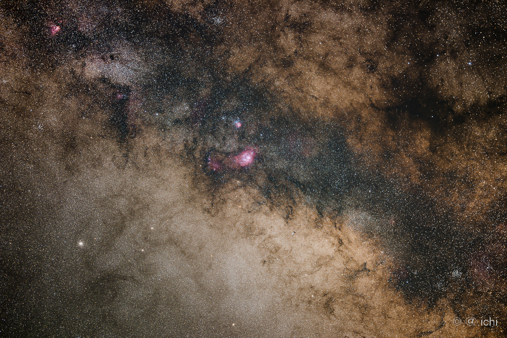 南の空が良い場所で、双眼鏡でさそり座からいて座、たて座のあたりを観測すると、まったく賑やかで見ていて飽きませんが、それを写真に写すと星の大集団をバックに濃い星雲から淡い星雲、球状星団・散開星団、そして不気味な暗黒星雲に天の川を横切る暗黒帯までが画面いっぱいにぎっしり写りこみ、とてつもなく感動的な一枚となります