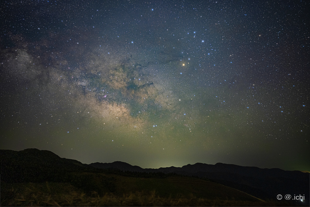 上記2枚の撮影の時間を使って、少し高台に上り星景写真を撮影してみました。伊豆南部の山々の上に昇るさそり座と天の川です。